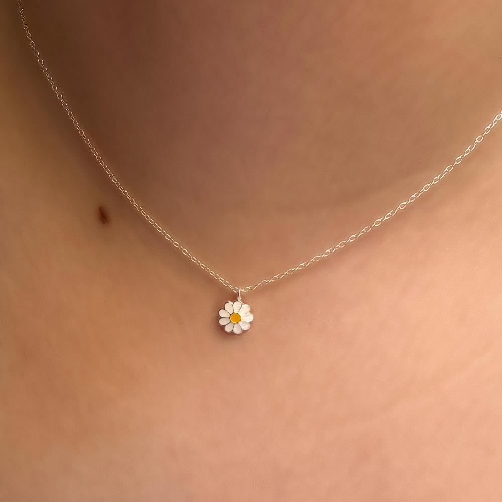 ✨ أضيئي يوم صغيرتكِ بلمسة من الجمال الطبيعي مع قلادة فضية ناعمة مزينة بتعليقة على شكل زهرة أقحوان، تتميز بقلب أصفر وبتلات بيضاء مصنوعة من مينا ناعمة تضيف لمسة مبهجة ورقيقة تليق بالطفولة.
