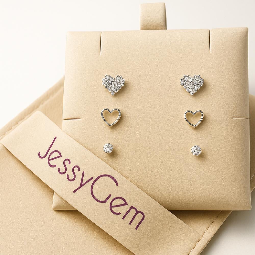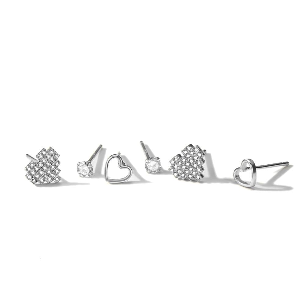 تميّزي بإطلالة أنثوية ساحرة مع طقم أقراط القلوب الفضية المصنوع من فضة إسترليني 925 الفاخرة، والمزيّن بزركونيا لامعة تمنحك إشراقة فريدة في كل يوم. يتميز الطقم بتنوع التصاميم ليمنحك حرية التنسيق حسب مزاجك وإطلالتك.