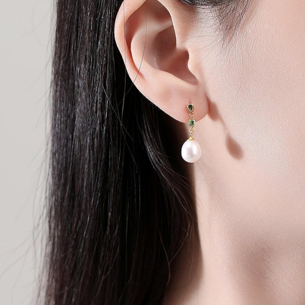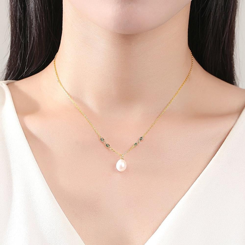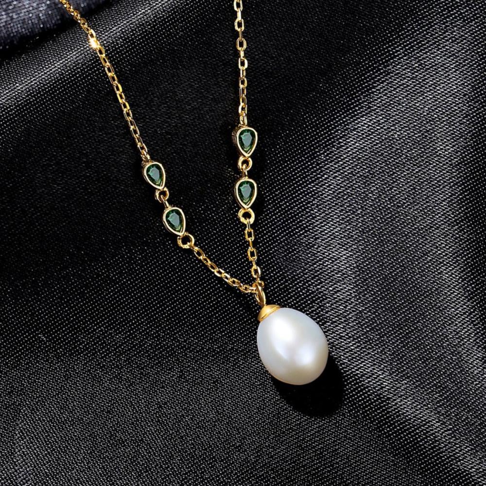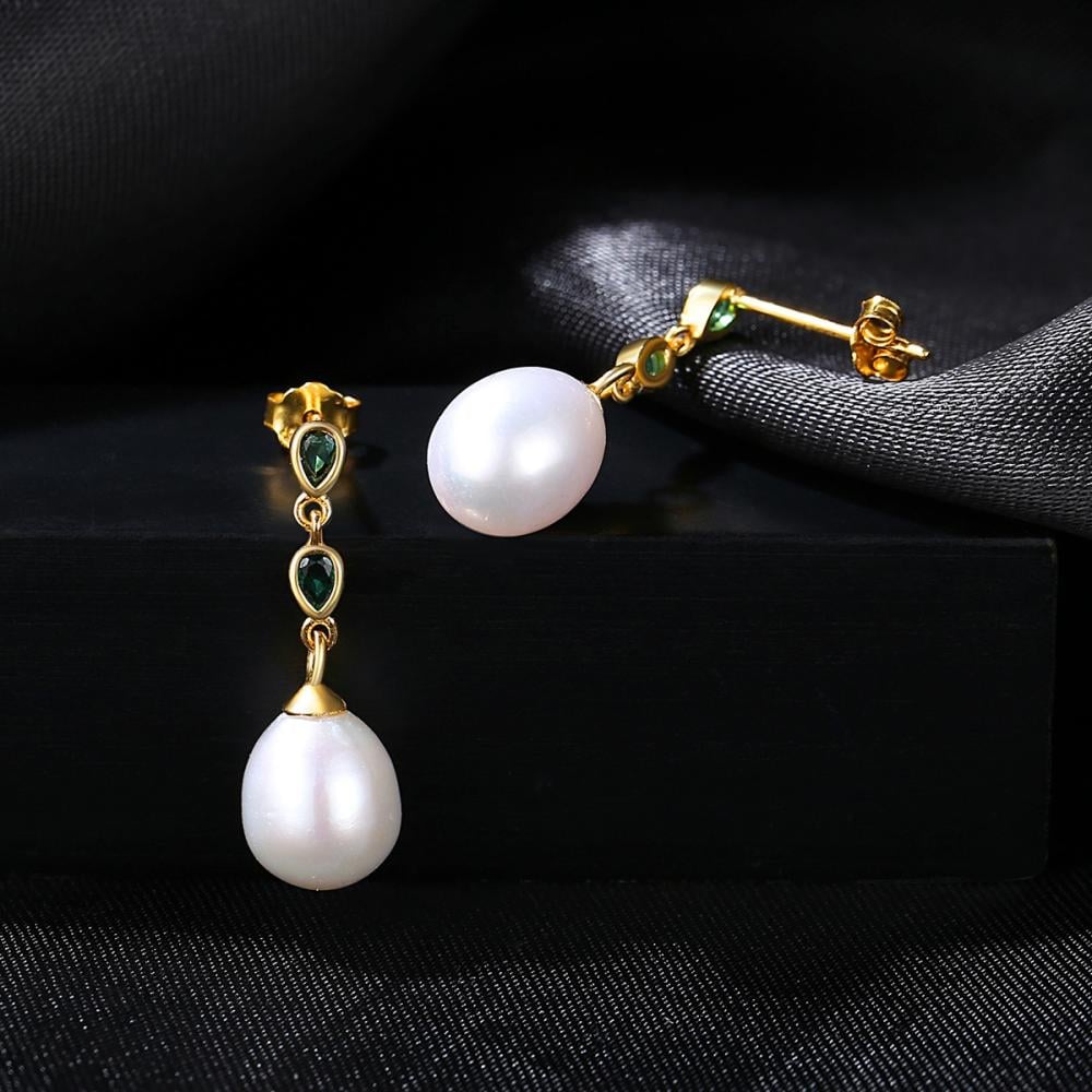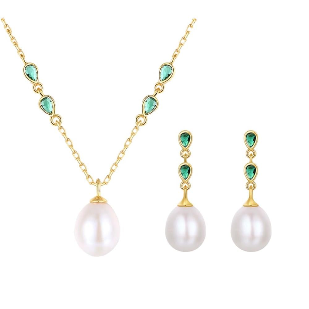 طقم فاخر يجمع بين اللؤلؤ الطبيعي وحجر الزركون الأخضر اللامع بتصميم أنثوي ناعم من فضة إسترليني 925 مطلية بالذهب.