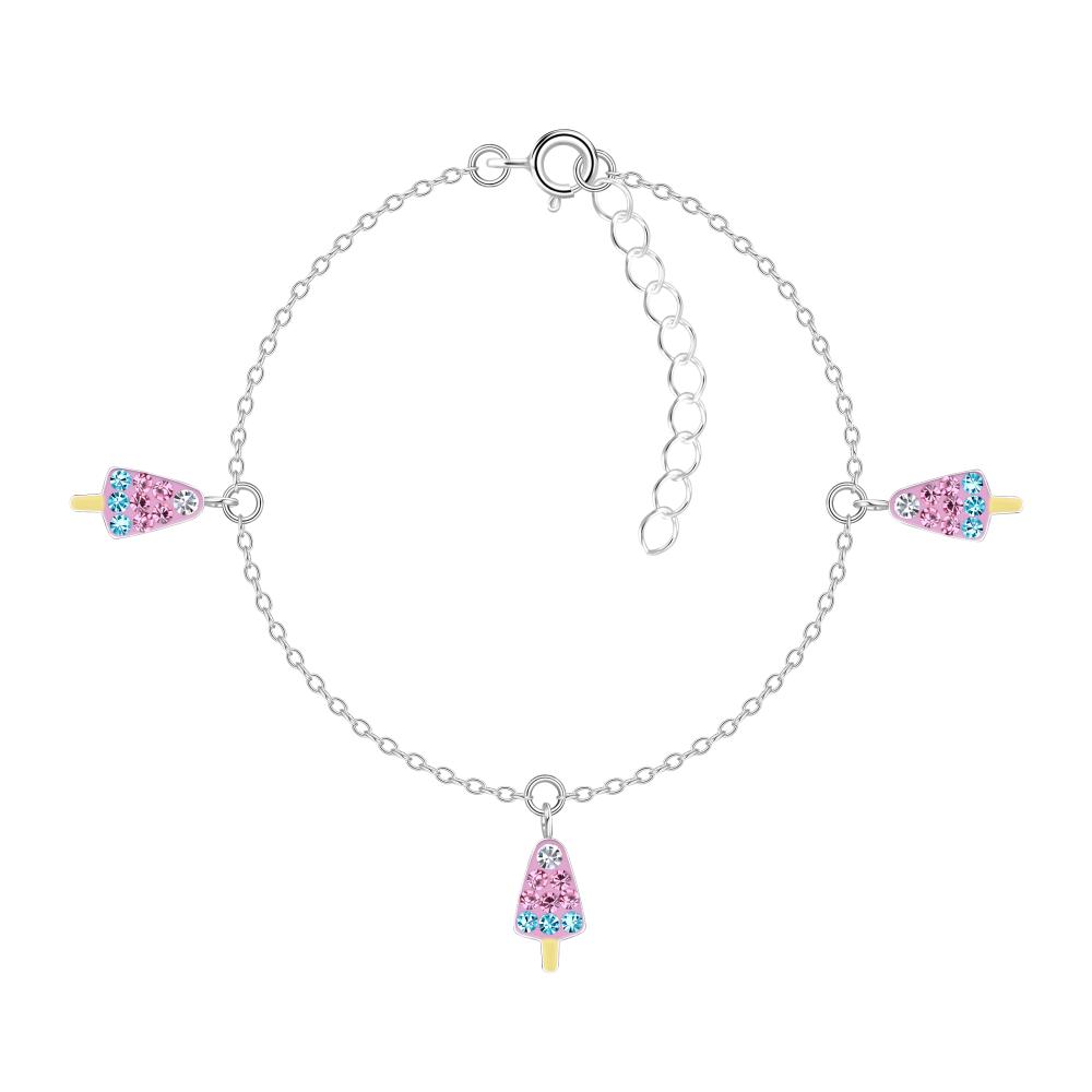 ✨ أضيفي لمسة من السعادة والألوان إلى إطلالة صغيرتكِ مع هذا السوار الفضّي المميز المصنوع من فضة إسترليني 925، والمزين بثلاث تعليقات صغيرة على شكل آيس كريم لامع، مزخرفة بكريستالات وردية، زرقاء وبيضاء تضفي طابعاً طفولياً مرِحاً.