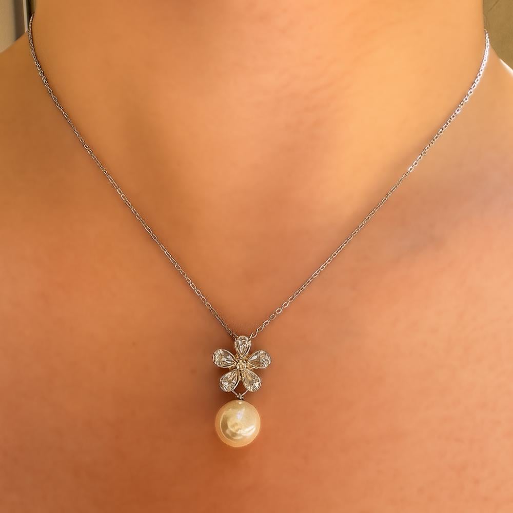 🌼 Delicate design combining silver flowers and luxurious white pearls.