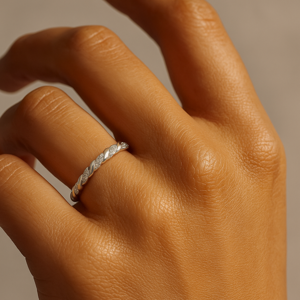 A beautifully crafted sterling silver ring featuring an elegant twisted design adorned with sparkling zircon stones. Its delicate yet modern look makes it a perfect choice for everyday elegance or special occasions.